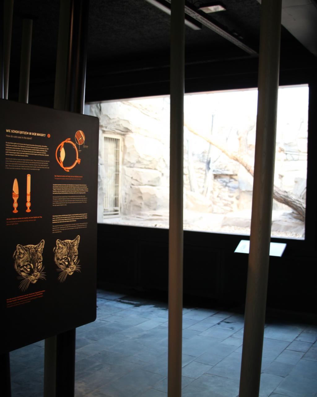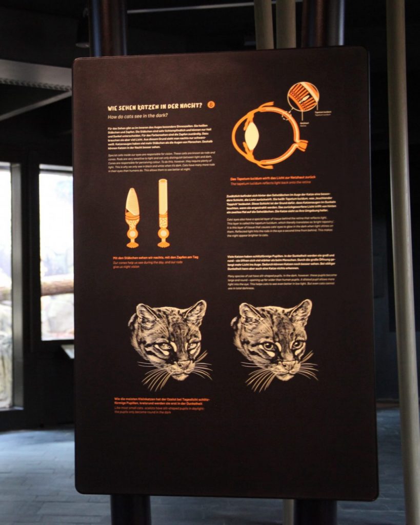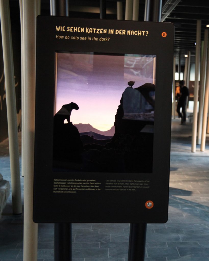 In dem Beispiel zeigt ein von Gabriele Ludewig gestaltetes Exponat, dass die Beutetiere im Vordergrund erst sichtbar werden, wenn man sie nach einem Tastendruck mit den Augen des Leoparden sieht. Auf der Rückseite wird mit Infografiken und Illustrationen von Falk Nordmann erklärt, warum Katzen in der Dämmerung 6-mal besser sehen als der Mensch.