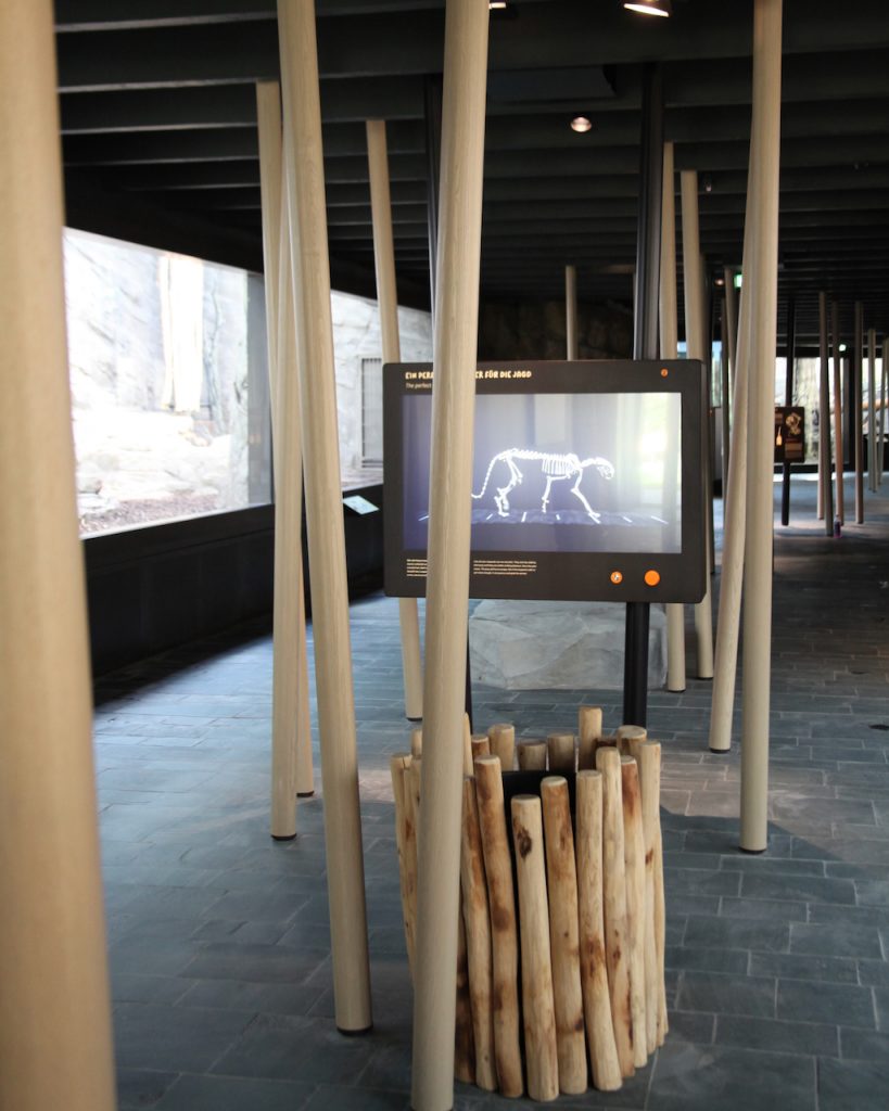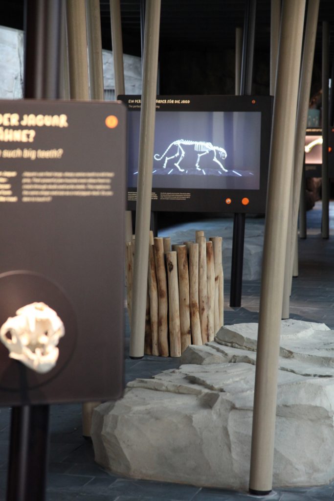 Hinter einem Sitzfelsen folgt dann das zweite Exponat mit einem 55-Zoll-Monitor, auf dem ein langsam gehendes Leopardenskelett zu sehen ist. Er ist so positioniert, dass seine Front beim Betreten der Ausstellung direkt zum Publikum weist und er gleichermaßen vom ersten Exponat aus zwischen den Stäben gut zu sehen ist. Auch hier war der Gedanke, die Faszination von Kindern für Bildschirme, auf denen sich etwas bewegt, zu nutzen, um sie zum Exponat hinzuführen. Dort können sie dann ihrem Spieltrieb folgen und beim Betätigen von Taster und Regler ausprobieren, was passiert.