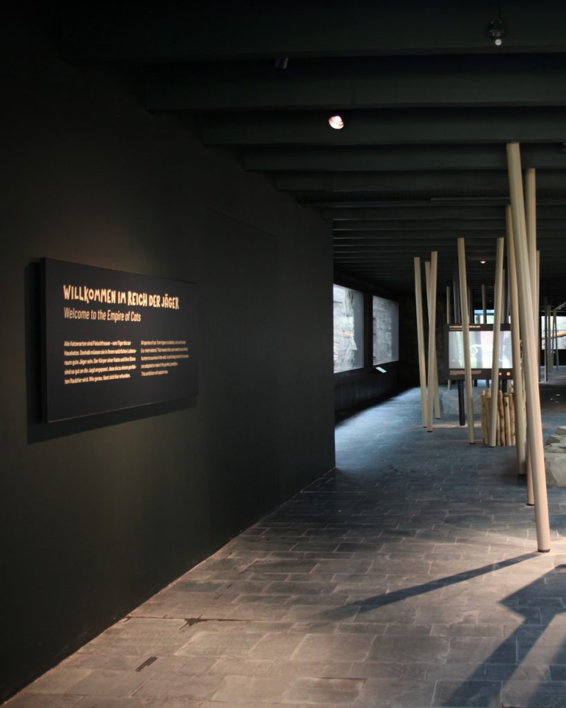 Ein noch wichtigerer Aspekt war, die Gegebenheiten der Architektur aufzunehmen. In dem schmalen, umlaufenden Gang des ringförmigen Gebäudes erzeugen dunkle Farben eine gedämpfte Lichtstimmung. Um Spiegelungen zu minimieren, befindet sich an den Stellen, wo große Fenster Einblicke in die Gehege bieten, auf der gegenüberliegenden Seite eine geschlossene Wand. Die dadurch entstehenden langen, dunklen Wandflächen galt es, zu bespielen, denn in den Gang gestellte Exponate hätten die durch die gebogenen Wände erzeugte Dynamik gestört.