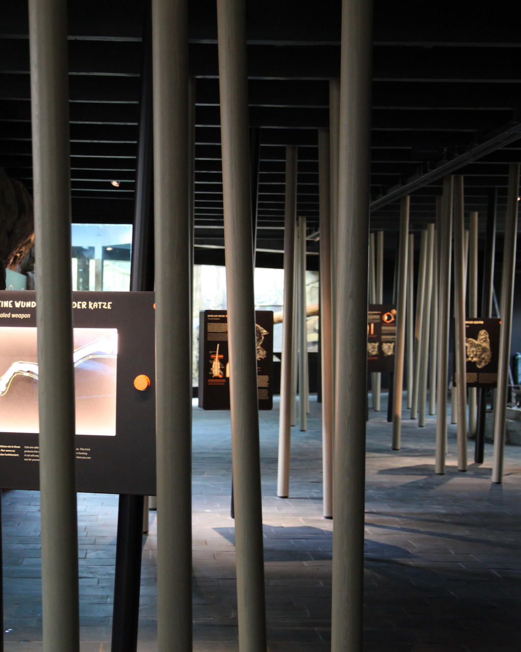 Dazu wurden zwischen Boden und Decke in unterschiedliche Richtungen leicht geneigte Rundstäbe verspannt. Durch einen dunkelgrünen Anstrich werden die Deckenrippen optisch zusammengezogen und erscheinen weniger dominant. Zwischen ihnen verschwinden die Rundstäbe wie Baumstämme in einem Blätterdach. Sie sind so positioniert, dass sie in Laufrichtung dichter und in Querrichtung offener stehen. Weil sie gleichzeitig als Halterung für Exponate dienen, wird ermöglicht, diese nach und nach wie Tiere im Urwald zwischen den Stäben zu entdecken. Da mit dieser Lösung auf einen Sockel verzichtet werden konnte, sind sie mit einem Rollstuhl problemlos unterfahrbar. Zugleich ist ein nach beiden Seiten freier Blick auf die Gehege gewährleistet.