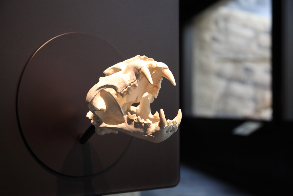 Das erste Exponat direkt am Eingang ist die exakte Nachbildung eines Jaguarschädels mit geöffnetem Maul in Originalgröße. Auf den Jaguar fiel die Wahl, weil sein Kausystem unter den Katzen die größte Beißkraft aufweist. Die Idee war, die Angstlust von kleineren Kindern anzusprechen und sie zum Berühren des Schädels als kleine Mutprobe zu animieren.